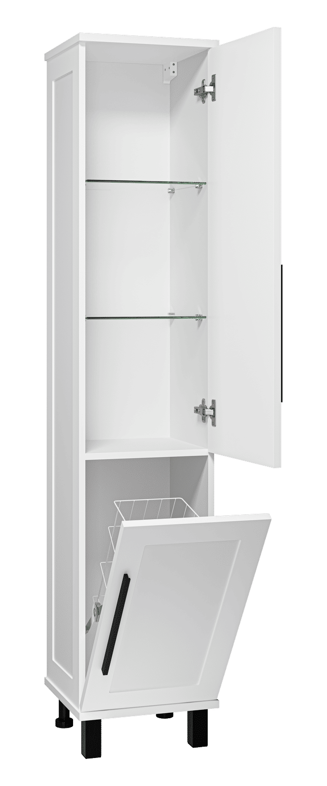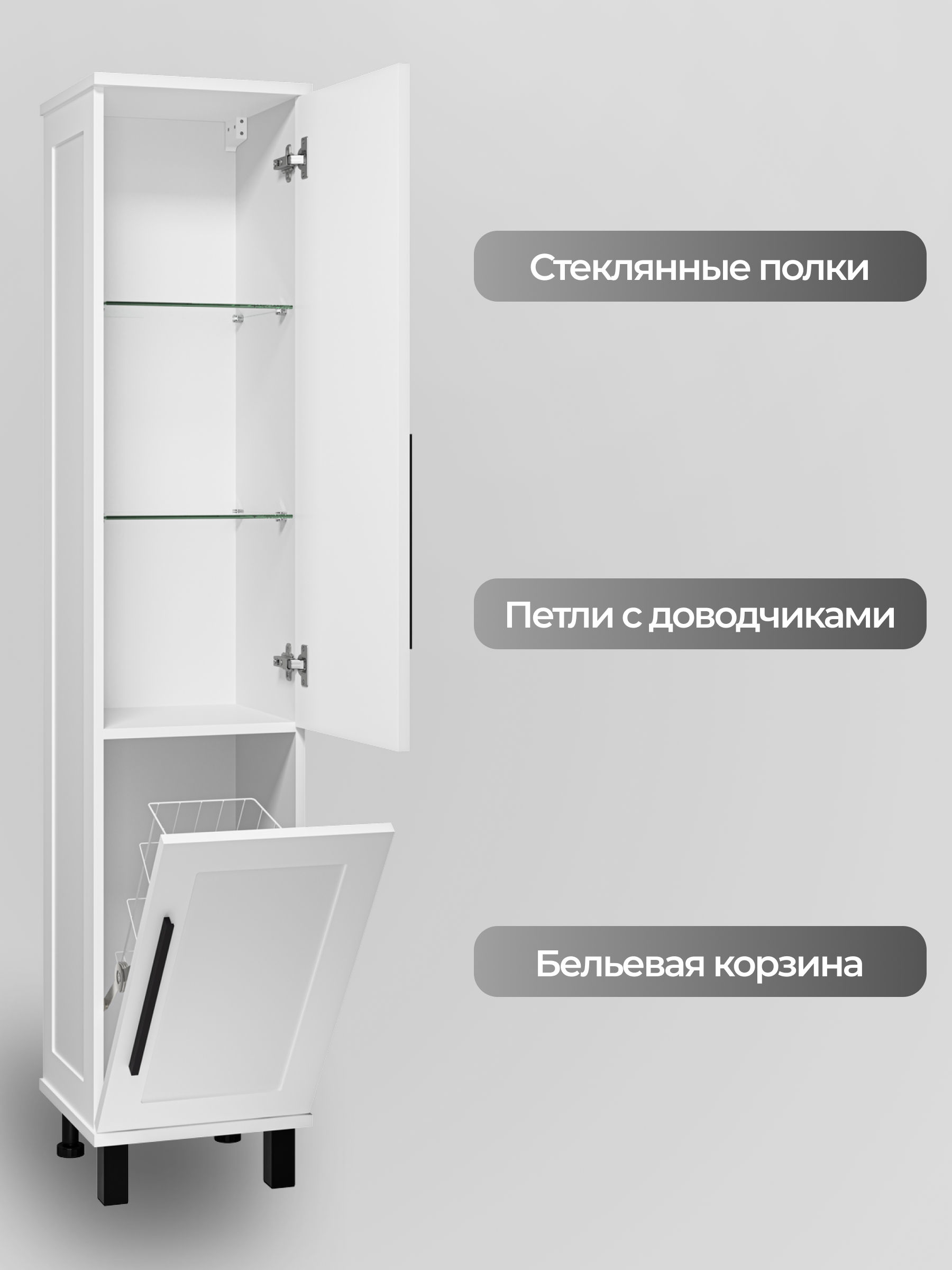 Шкаф-пенал для ванной Misty Модерн оснащен дверцей, полками и удобной бельевой корзиной, что позволяет эффективно организовать пространство и поддерживать порядок. Петли с доводчиками обеспечивают плавное и бесшумное закрывание, добавляя комфорт в повседневное использование.