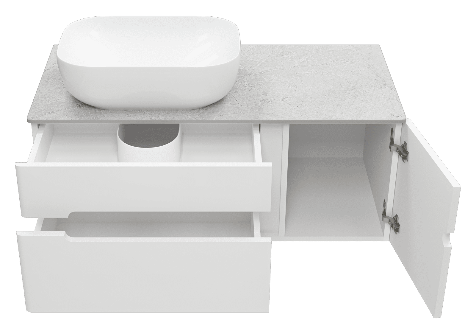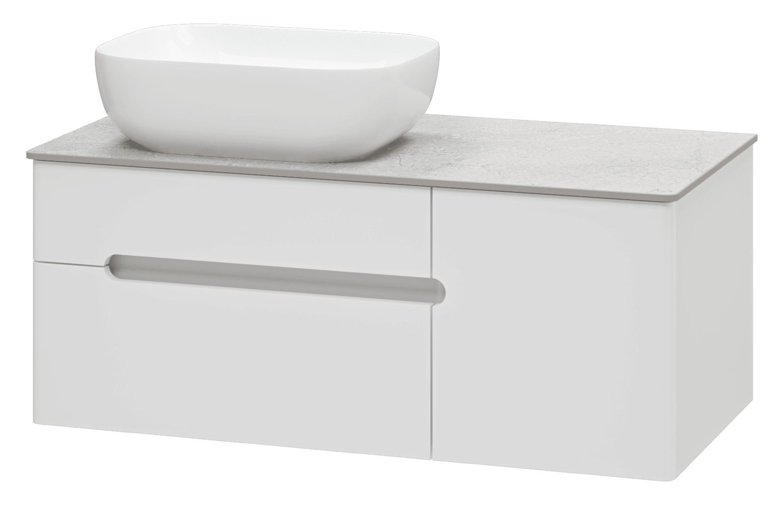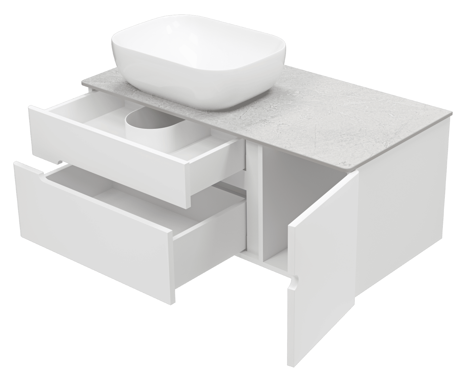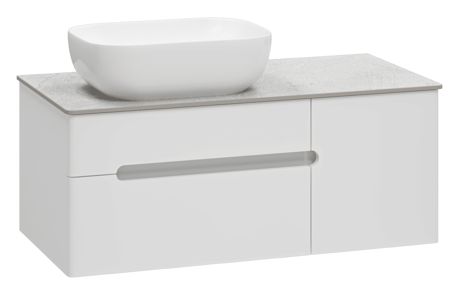 Подвесной монтаж тумбы делает ее визуально более компактной, чем аналогичные модели с напольной установкой. На такую тумбу можно установить накладную раковину разного размера и формы. Внешняя фурнитура отсутствует, для удобного открывания фасадов есть специальные прорези в дверцах и ящиках. У тумбы есть два выдвижных ящика и одно отделение с распашной дверцей.
