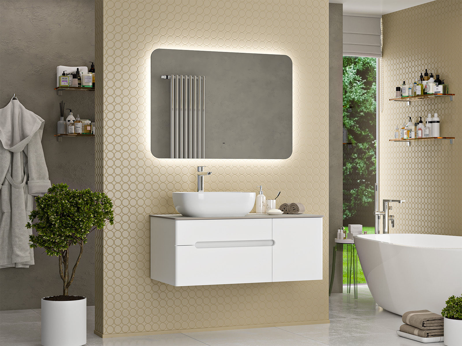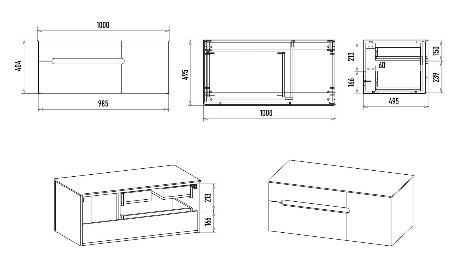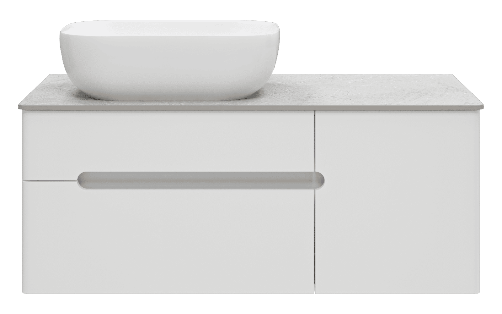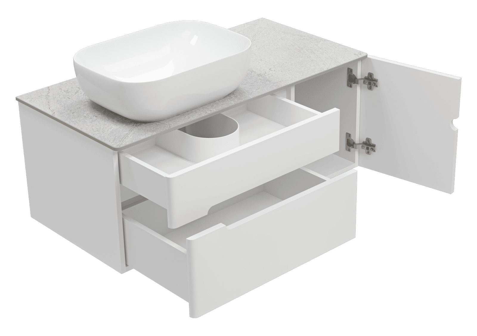 Подвесной монтаж тумбы делает ее визуально более компактной, чем аналогичные модели с напольной установкой. На такую тумбу можно установить накладную раковину разного размера и формы. Внешняя фурнитура отсутствует, для удобного открывания фасадов есть специальные прорези в дверцах и ящиках. У тумбы есть два выдвижных ящика и одно отделение с распашной дверцей.