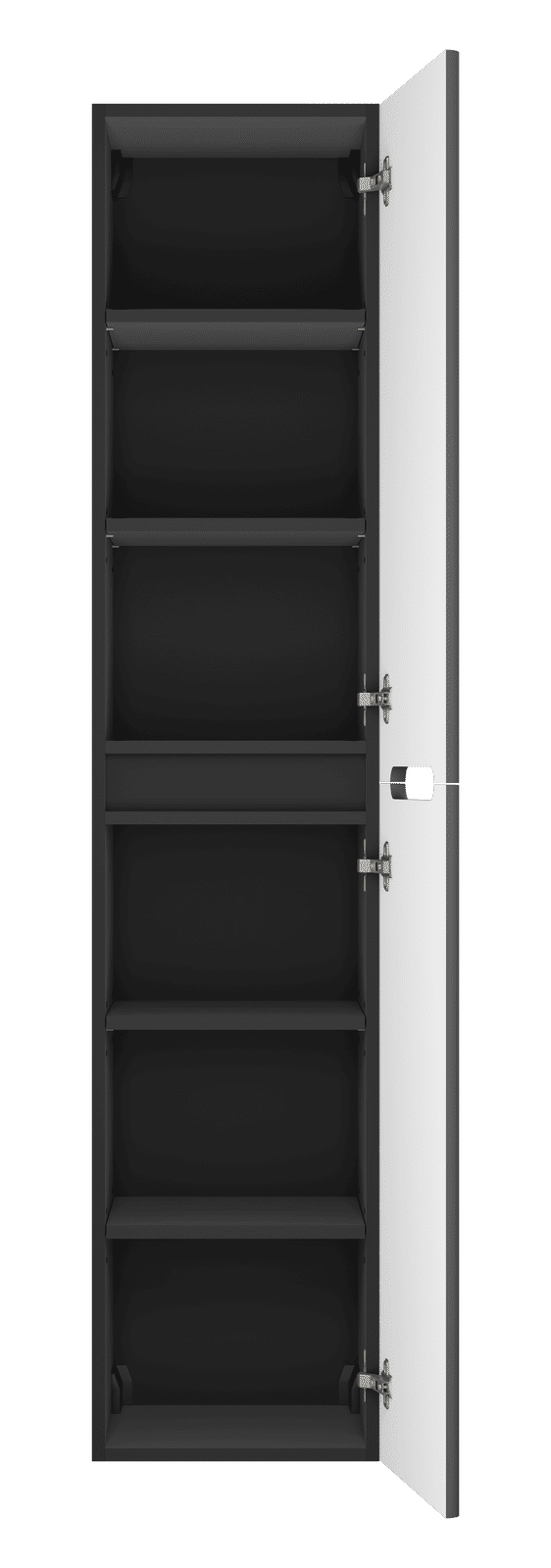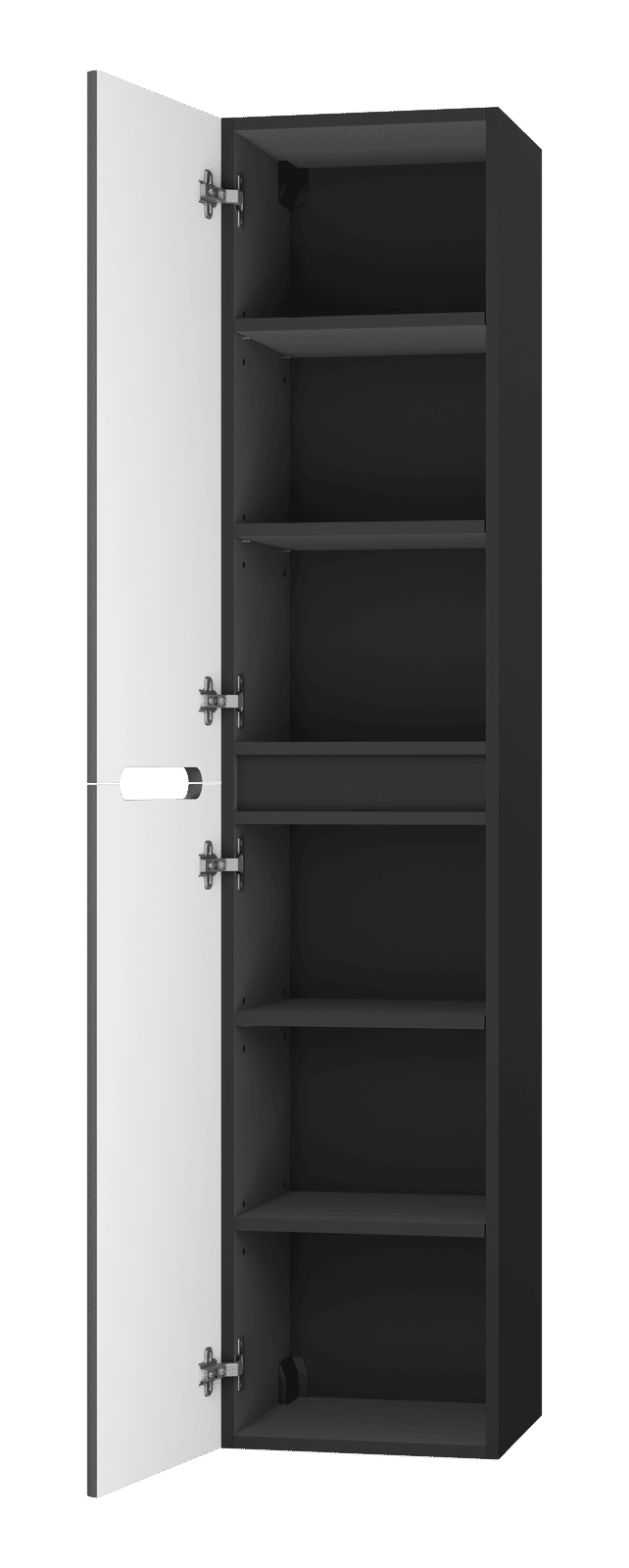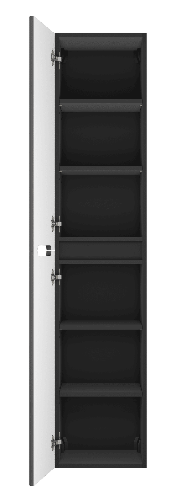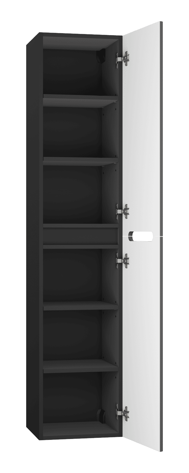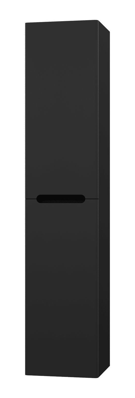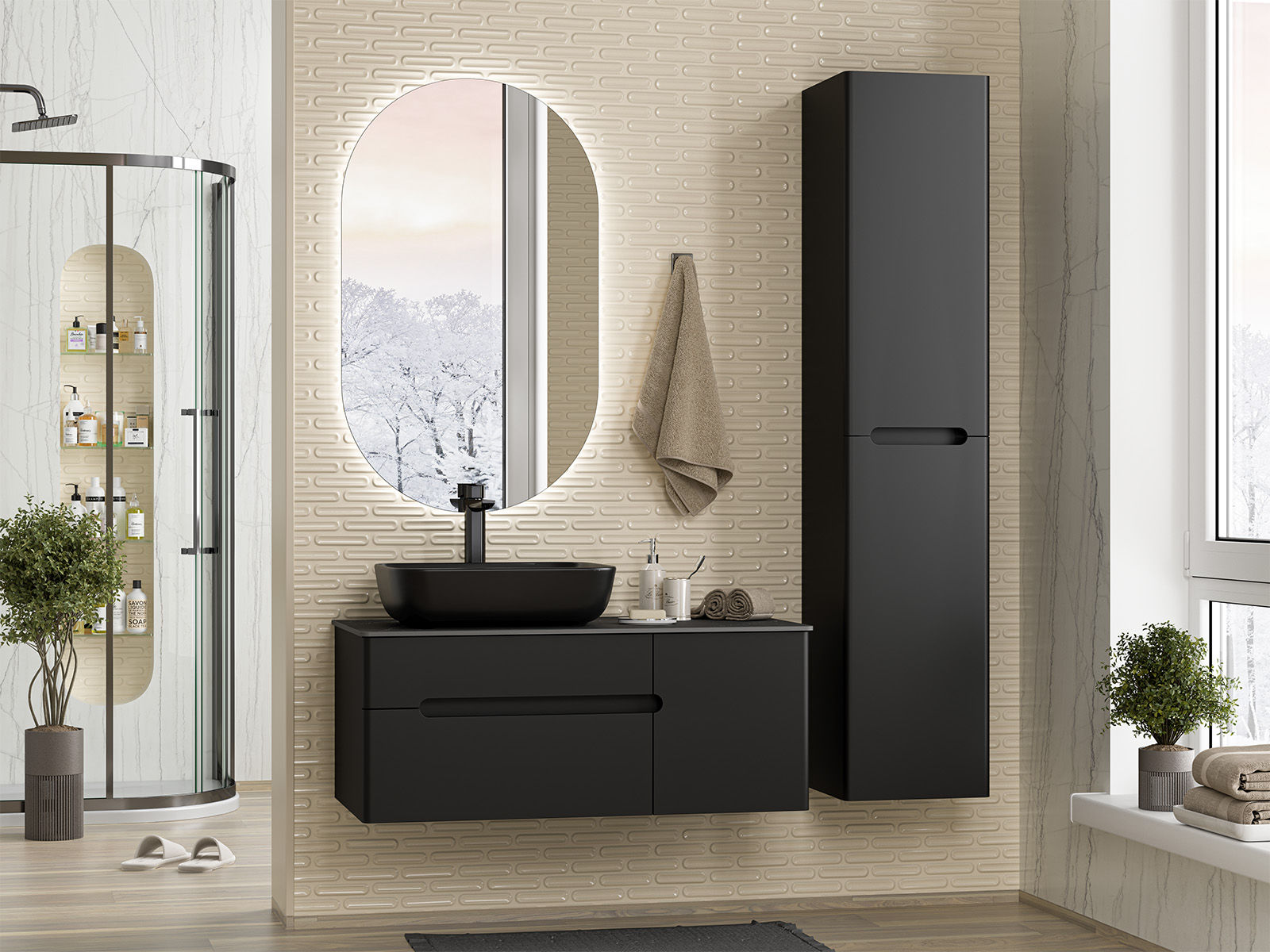 Подвесной монтаж тумбы делает ее визуально более компактной, чем аналогичные модели с напольной установкой. Внешняя фурнитура отсутствует, для удобного открывания фасадов есть специальные прорези в дверцах и ящиках.