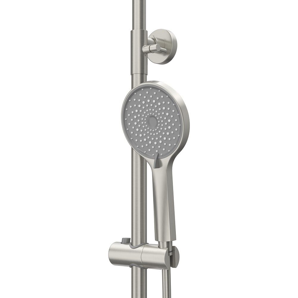 Система поставляется с полным комплектом для мгновенного наслаждения. Вас ждет просторный верхний душ размером 230х230 мм, который подарит ощущение освежающего тропического ливня. Его положение можно регулировать по высоте до 32 см, чтобы создать идеальный поток для любого члена семьи. Трехрежимная ручная лейка из прочного ABS-пластика предлагает на выбор различные варианты массажа, а эргономичный поворотный держатель и гибкий шланг длиной 150 см обеспечивают невероятную свободу движений.