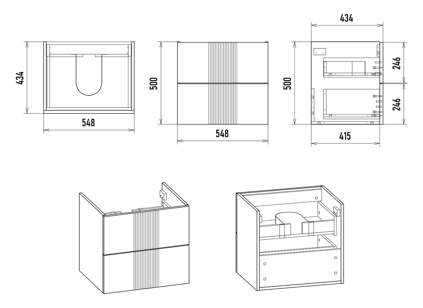 Тумба имеет подвесную конструкцию, что позволяет экономить пространство. Внешняя фурнитура не предусмотрена — ящики на тумбах открываются легким нажатием на фасад, благодаря механизму Push-to-Open.