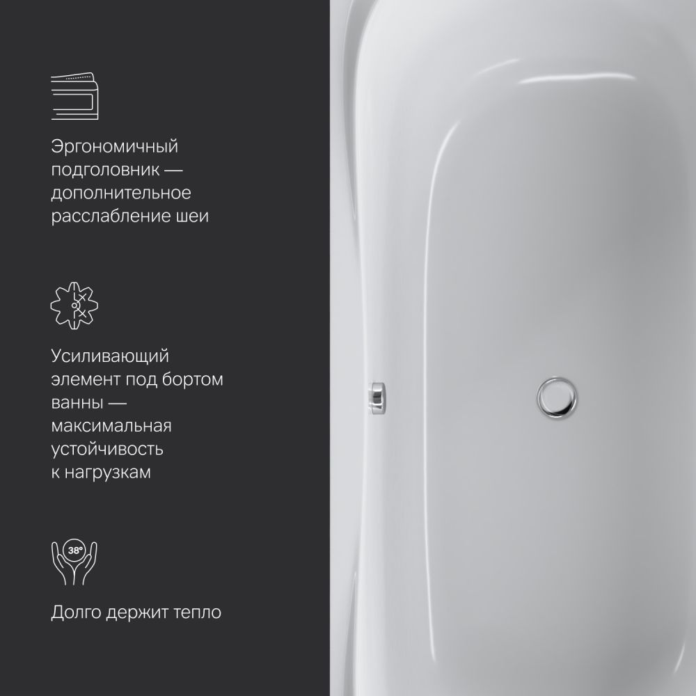 Необычайно вместительна: увеличенный внутренний объем при стандартных внешних габаритах благодаря ультратонким бортам делает процесс принятия ванны комфортным для человека любой комплекции.