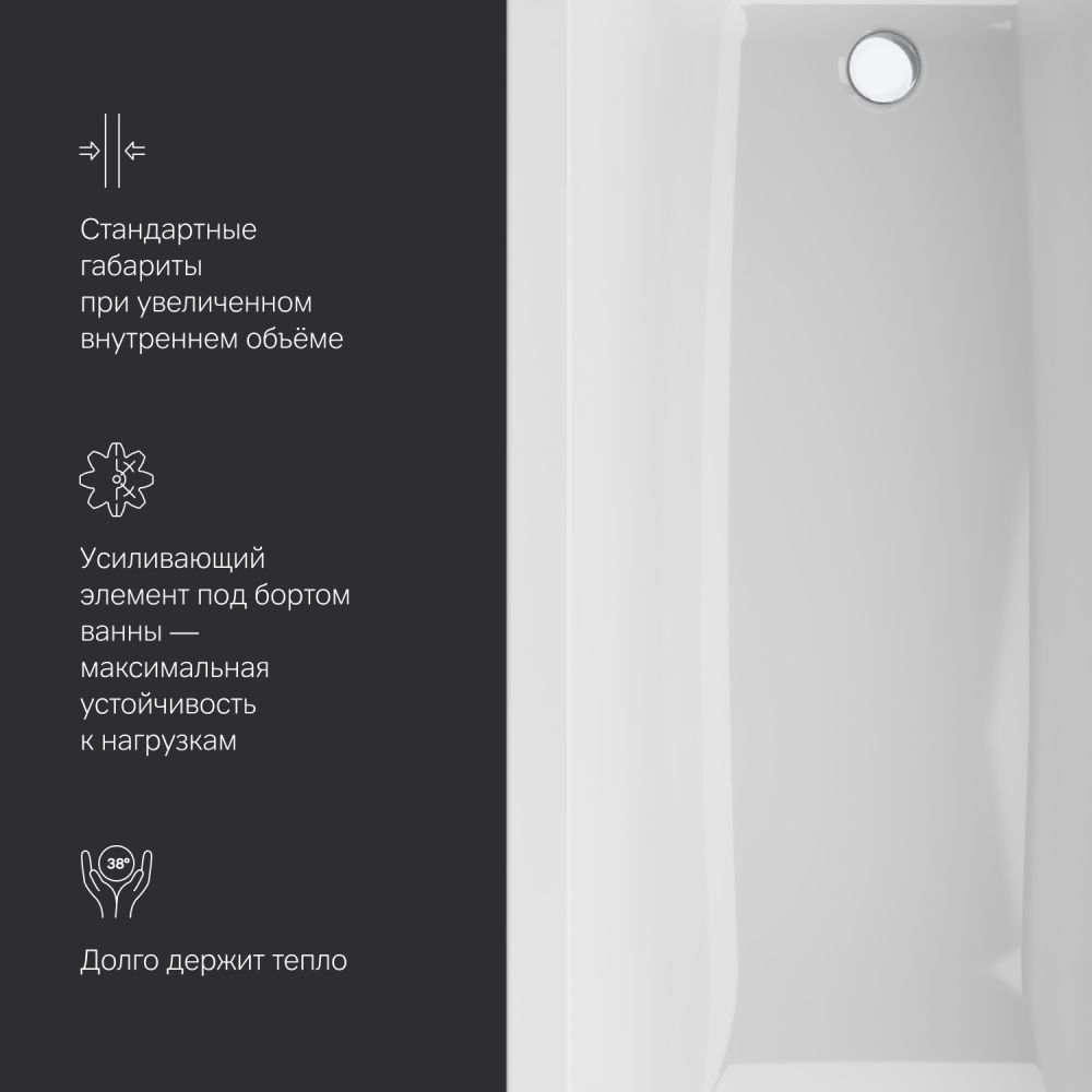 Удобная спинка и оптимальные размеры ванной гарантируют полное расслабление и хороший отдых. За счет низкой теплопроводности и теплоемкости акрила ванна поддерживает температуру набранной воды.