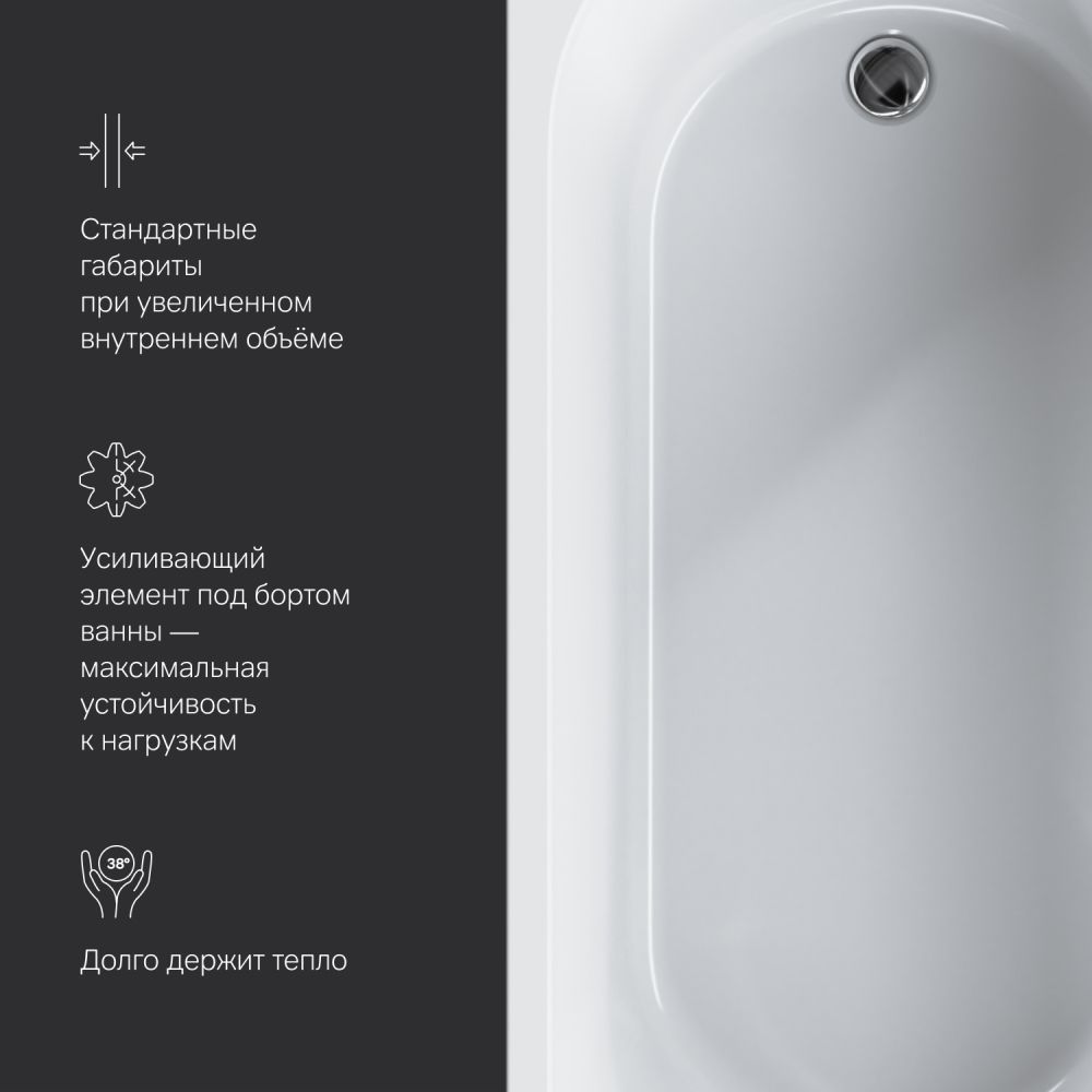 Компактная проекция 170×75 см позволяет вписать ванную даже в небольшое помещение. А универсальный дизайн подойдет как для современного, так и для классического интерьера.